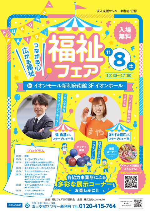 福祉フェア 予定表 2025/11/08(土) 10:30 - イオンモール新利府南館 3F イオンホール 地図を表示 ベガルタ仙台クラブコーディネーターの梁勇基さん、スクール指導員として活動中の萬代 宏樹さん、いしのまき観光大使のほやドル萌江が登場!!体験ブースや展示コーナーも盛りだくさん♪ URLをコピーする 報告する