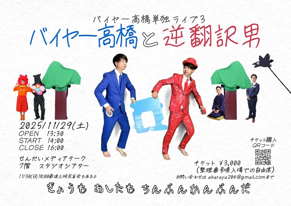 〜バイヤー高橋 単独ライブ3〜 「バイヤー高橋と逆翻訳男」 予定表 2025/11/29(土) 14:00 - せんだいメディアテーク7F スタジオシアター 詳しくはこちら URLをコピーする 報告する